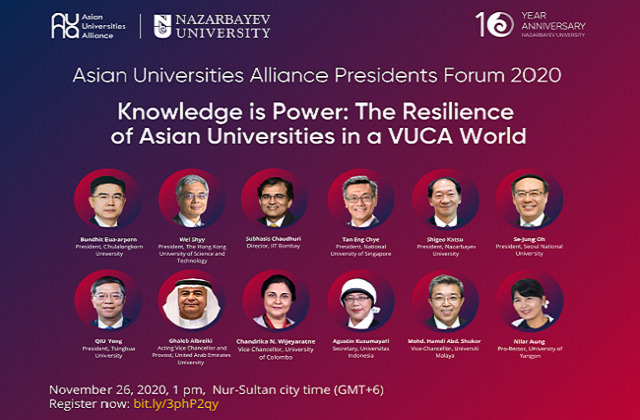 The Asian Universities Alliance Presidents Forum (AUAPF) 2020, themed "Knowledge is Power: The Resilience of Asian Universities in a VUCA World", jointly organized and hosted by AUA Executive Presidency 2020-2021 Nazarbayev University and the AUA Secretariat, will be held online from 15:00-18:40 ...