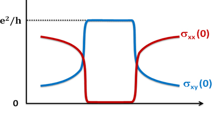 Schematic illustration of the quantum anomalous Hall effect: when the chemical potential is tuned into the energy gap at the Dirac point of a ferromagnetic topological insulator, the zero magnetic field anomalous Hall conductance sxy(0) reaches the quantized value e2/h and forms a plateau, whereas the longitudinal conductance sxx(0) drops to 0.