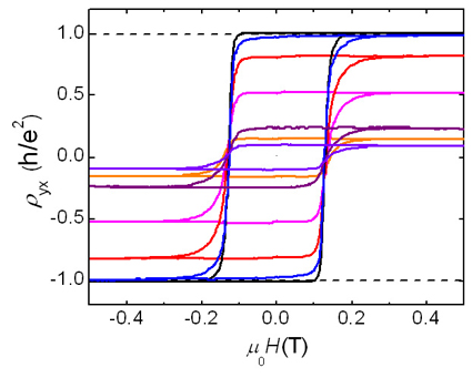 Experimental results showing the quantum anomalous Hall effect: the different curves represent the field dependence of the Hall resistance measured at varied gate voltages. Within a certain range of gate voltages, the zero magnetic field anomalous Hall resistance reaches the quantized value h/e2.