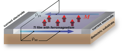 Schematic device structure for the quantum anomalous Hall effect measurements:  we fabricated the ferromagnetic topological insulator thin films grown by molecular beam epitaxy into a field effect transistor device, and performed high precision measurements of its Hall resistance and longitudinal resistance.