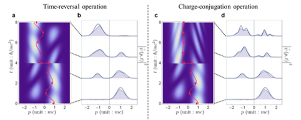 Figure 2 Time reversal and charge conjugation on the Majorana dynamics in momentum space. The evolution is governed by the Majorana equation and the symmetry operations are performed at the midpoint t = 4. a,b. Right after the time-reversal operation, the momentum as well as the velocity changes sign. c,d. By definition, the particle and corresponding antiparticle have opposite momentum but the same velocity. As a result, right after the charge-conjugation operation, the average momentum is reversed but not the velocity.