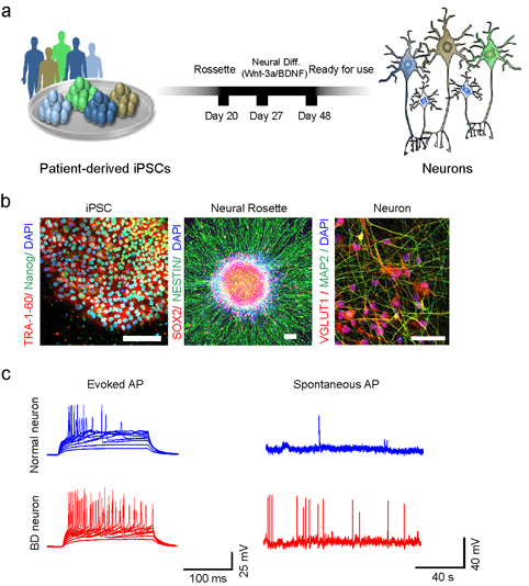 Figure. Hyperexcitability in hippocampal neurons derived from iPSCs of bipolar disorder patients. a, Diagram showing the differentiation of hippocampal DG-like neurons from BD patient iPSCs. b, Representative immunostaining images of iPSCs, neural rosettes and neurons. c, Sample traces of current injection-evoked (left) or spontaneous (right) action potentials (APs). BD neurons exhibited hyperexcitability compared to normal neurons.