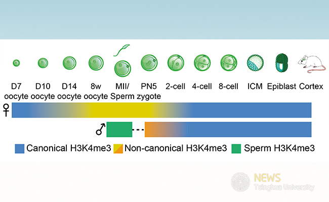 In the work described in Nature, the authors developed STAR ChIP–seq and reported how a key histone mark H3K4me3 was transmitted from gametes to the next generation. Upon fertilization, extensive reprogramming occurs on the paternal genome, as sperm H3K4me3 peaks are rarely observed in zygotes, suggesting a global erasure of paternal H3K4me3. Paternal H3K4me3 peaks are then readily observed after major zygotic genome activation at the late two-cell stage. By contrast, H3K4me3 from oocytes is inherited after fertilization which persists until the 2-cell stage before zygotic genome activation (ZGA) starts. Unexpectedly, the authors find a surprising non-canonical form of H3K4me3 (ncH3K4me3) in full-grown and mature oocytes, which exists as broad peaks at promoters and a large number of distal loci. Such broad H3K4me3 peaks are in contrast to the typical sharp H3K4me3 peaks restricted to CpG-rich regions of promoters. Notably, ncH3K4me3 in oocytes overlaps almost exclusively with partially methylated DNA domains. It is then inherited in pre- implantation embryos, before being erased in the late two-cell embryos, when canonical H3K4me3 starts to be established. The removal of ncH3K4me3 requires zygotic transcription but is independent of DNA replication-mediated passive dilution. Finally, the authors showed that downregulation of H3K4me3 in full-grown oocytes by overexpression of the H3K4me3 demethylase KDM5B is associated with defects in genome silencing, indicating ncH3K4me3 may function as a repressive mark, instead of an active mark, in oocytes and early stage embryos.