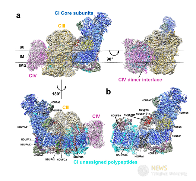 Respiration is the most basic activity of all living organisms. Respirasome abnormality in human can lead to various serious diseases, including Alzheimer’s and Parkinson’s diseases, multiple sclerosis, Friedreich’s ataxia and amyotrophic lateral sclerosis. Respirasome, which is a gigantic molecular machine responsible for cellular respiration, locates in the inner mitochondrial membrane (IMM). In 1997, American scientist Hackenbrock proposed the fluid model claiming that four protein complexes, including NADH dehydrogenase (CI), succinate dehydrogenase (CII), cytochrome bc1 complex (CIII) and cytochrome c oxidase (CIV), are separately scattered in the IMM, and each of them catalyzes one step of respiration, while since 2000, more and more evidence shows these complexes are not independent from of each other, but can combine to form a higher order structure, supercomplex (SC). Different combination types can form different supercomplexes, among which SCI1III2IV1 is the most abundant and important.