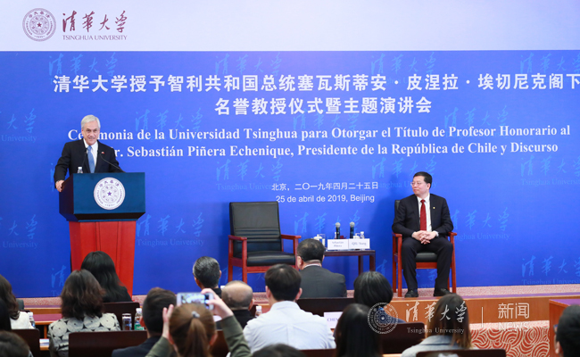 On April 25th, on the occasion of the 108th anniversary of Tsinghua University, Sebastian Pinera Equeniche, President of the Republic of Chile, visited Tsinghua University. During his visit, President Pinera received the title of Honorary Professorship of Tsinghua University and delivered a speech entitled "Chile and China: Facing Together the Challenges and Opportunities of the Future".
