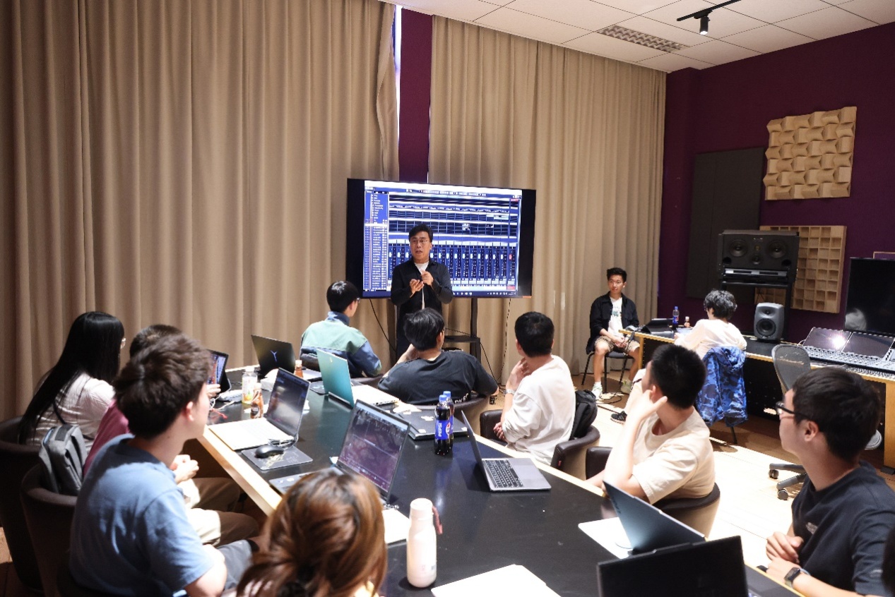 Unlike his preamble Film Music Appreciation course, Film Scoring focuses on giving students practical creative experience at the practical level. Therefore, Cheng divides the course into two stages - foundational preparation and formal creation. During the first stage, students learn basic music theory, harmony, instrumentation and orchestration and software usage. Once they have mastered the foundational content, the course enters the formal creation stage. In order to bring students a better learning experience, the instructional format of the class is adjusted as the class progresses. In the "preliminary preparation" stage, since students need to learn about relevant music theories and software operations, the classroom location is chosen to be in the traditional layout of the classroom, which is convenient for the teacher to perform classroom demonstrations and help students solve various software installation technical problems. In the latter half of the course, the classroom is selected to be one that replicates the live feeling of "Dolby Atmos" film scorings, breaking the traditional classroom model and allowing students to gain a more immersive and authentic experience during the learning process.