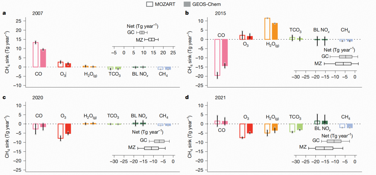 Global atmospheric CH₄ concentrations have surged since 2007. Beyond natural and anthropogenic CH₄ emissions from wetlands, energy production, agriculture, and waste management, atmospheric oxidation processes, particularly the removal of CH₄ by OH, are also key regulators of its concentration. OH is the primary oxidant in the atmosphere and accounts for approximately 90% of CH₄ chemical consumption. However, long-term quantification of how air pollutants influence global OH levels and CH₄ budgets over decadal scales remains limited. Conventional studies often solely rely on observation datasets or atmospheric model simulations, which struggle to fully capture the complex dynamic interactions between air pollutants, OH concentrations, and CH4 sinks.