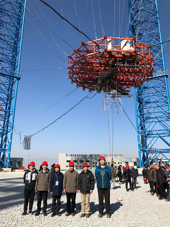 Xiaoqiang Tang's team in front of the scaffolding that helped frame their cable-driven Mars simulator.