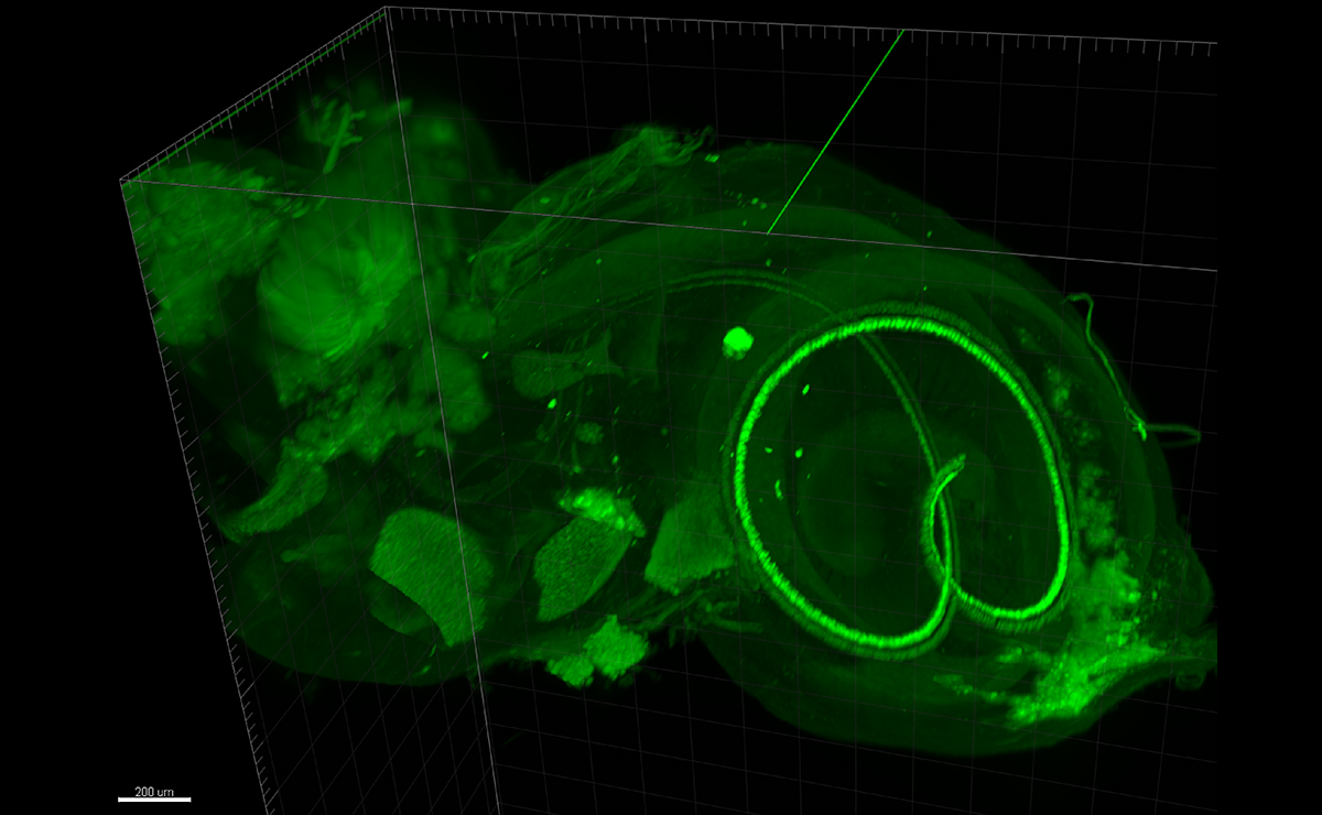 The researchers doubled checked that the loss of ultrasonic hearing in mice bred not to express ion channel Piezo2 in their outer hair cells was not due to a loss of hair cells at the basal coil of the cochlea by imaging mouse ears. The whole structure of the inner ear appeared intact with hair cells remaining in normal allocation and abundance in the above video, they wrote.