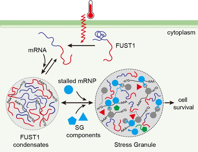 Figure 2. A model illustrating the role of FUST1 in sensing temperature and priming stress granule assembly via its condensation.