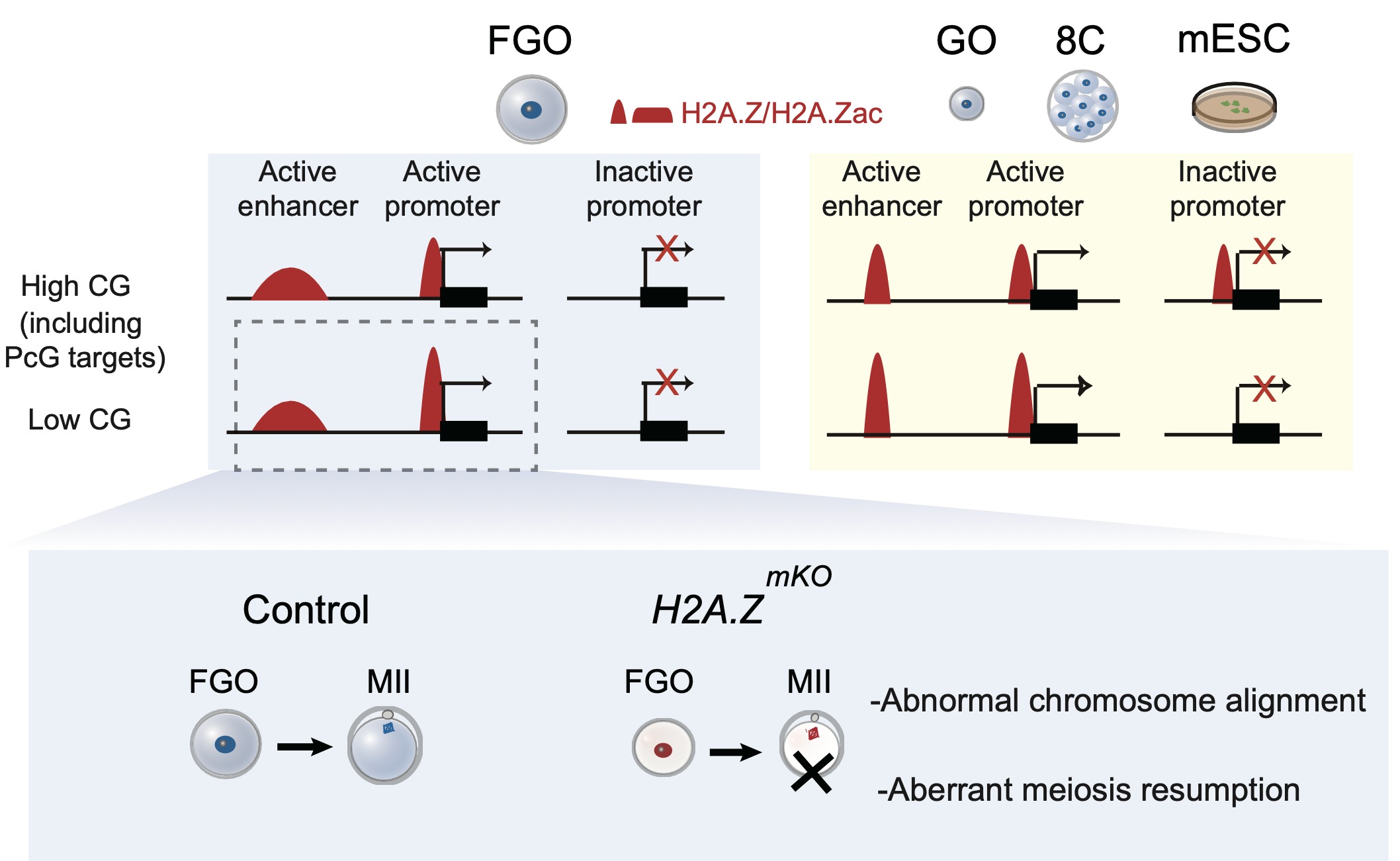 In this study, the researchers demonstrated that H2A.Z is predominantly localized at active enhancers and promoters, but not at poised promoters, in fully grown oocytes (FGOs). Ablation of H2A.Z in oocytes leads to severe defects including meiotic arrest, impaired chromatin condensation, and ultimately female infertility. Mechanistically, H2A.Z facilitates CRE activity as H2A.Z mutation leads to reduced active chromatin features associated with transcription, such as H3K27ac and H3K4me3, which is accompanied by transcriptional dysregulation and impaired oocyte developmental competence. In sum, this work identifies H2A.Z as a key chromatin regulator in oocytes, highlighting its role in maintaining enhancer and promoter function during oocyte maturation. These findings emphasize the broader significance of histone variants in regulating gene expression programs that control gametogenesis and the maternal-to-zygotic transition.
