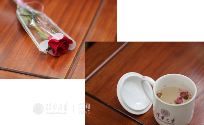 现场赠与女教职工代表的玫瑰与花茶