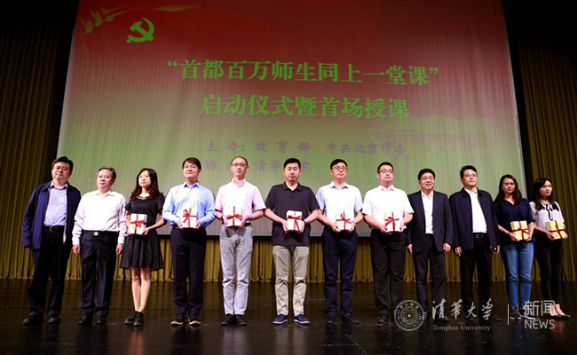 杜飞进等为“首都百万师生同上一堂课”讲师团授课专家代表颁发聘书,相关领导为干部师生代表赠送学习辅助读物——《习近平总书记关于青年学生成长成才和教师思想政治工作重要论述摘编》。
