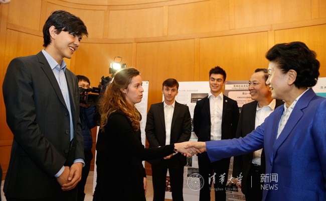 在苏世民书院,刘延东考察了解了书院的发展近况,观看了“中国社会实践课程”的学生成果展示,与实践指导教师及学生代表互动交流。刘延东对同学们说,苏世民书院作为中美两国元首共同支持的项目,建在中国、面向世界、融入新葡萄,是中国乃至世界高等教育改革创新的体现。今后的中国将更加开放,同学们来自世界各地,希望大家增强跨国界、跨种族、跨地域的学习交流,深入了解中国,交流心得体会,共同面对人类未来发展面临的挑战,为构建人类命运共同体做出自己的努力和贡献。