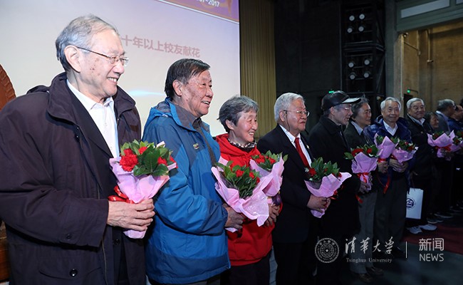 在校学生向毕业50年及以上校友、老领导献花。杨艳宾 摄