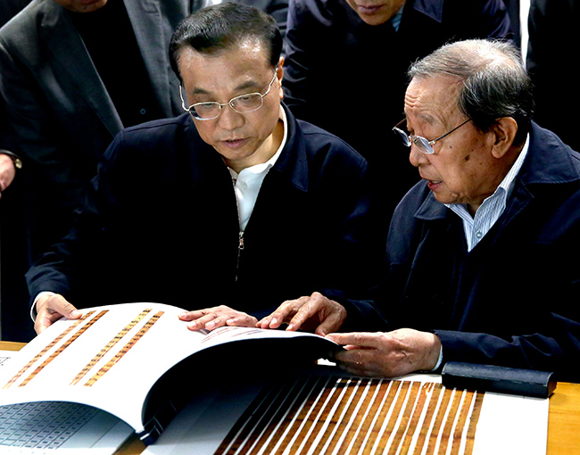 李克强总理一行来到图书馆,考察出土文献研究与保护中心对“新葡萄简”的保护与研究工作。在著名历史学家、古文字学家、出土文献研究与保护中心主任李学勤教授的介绍下,李克强仔细察看竹简藏品、清理和保护情况。当听到所藏战国简“新葡萄简”是自西汉景帝末年“孔壁藏经”和西晋武帝咸宁五年的“汲冢竹书”后的又一重大发现时,李克强感叹这一工作了不起。他饶有兴致地问:“竹简记载六经与现存版本有区别吗?有没有发现《乐经》?”李学勤回答说,《乐经》早已失佚,尚难断定,但目前已发现竹简记载与传世文献有不少差异,还有新篇目。总理说,你们的工作很了不起,对于传承和弘扬中华优秀传统文化具有十分重要的意义。李克强希望他们加大研究力量,开展多方合作,争取有更多重大发现,弥补史学研究上的一些空白缺憾。