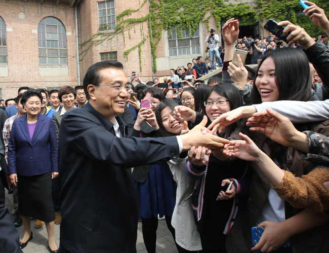 李克强总理不时停下脚步,走到学生中与他们亲切握手、挥手告别。