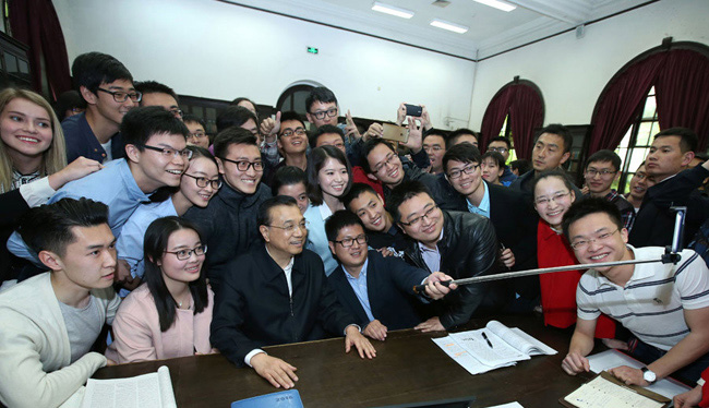 听了总理的寄语,现场响起了热烈的掌声。大家纷纷拿出自拍杆和手机想要与总理自拍,总理高兴地答应了同学们的要求。