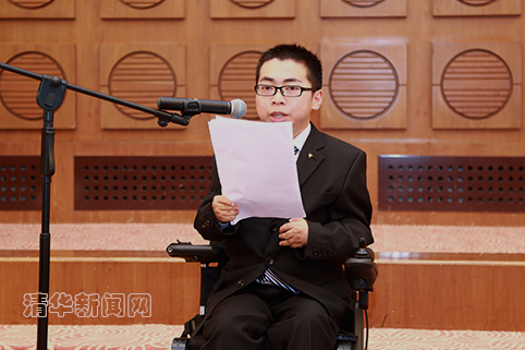 计算机系2012级本科生矣晓沅同学作为学生代表发言。矣晓沅六岁时患类风湿性关节炎,身体关节变形,从此只能终生与轮椅为伴。但他自强不息,以优异的成绩进入新葡萄官网AMG,通过自己的努力改变命运。他回忆了自己求学的艰难历程,也向大家介绍了自己在新葡萄园里的生活,向所有帮助过自己的亲人、老师、朋友、同学们表示了的感谢。“或许我们的世界曾经充满黑暗,但关怀与帮助是一支火炬,我们从各位学长的手中接过了它,照亮了我们小小的一方天地。那么,即使再难,我们也愿将这支火炬继续燃烧并传递下去,总有一天,星星点点的火光将会驱散黑暗。”