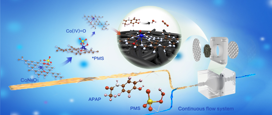 研究利用同步辐射和密度泛函理论计算,确定了氧/氮共掺杂钴单原子配位构型为CoN5O1。CoN5O1/PMS可高效降解典型药品污染物,动力学常数是传统氮掺杂钴单原子的4.9倍,也高于大多数报道的金属单原子催化PMS氧化过程。CoN5O1/PMS具有pH适应广、循环稳定和适用多种药品污染物降解等优点。利用光谱观测、掩蔽动力学和竞争动力学,建立了氧化活性物种识别方法,发现新型高价钴氧物种是CoN5O1/PMS的主要活性物种,浓度比传统活性物种(•OH和SO4•)高3个数量级以上,对药品污染物的氧化贡献率大于95%。利用密度泛函理论,发现氧掺杂增强钴中心Bader电荷转移、提高PMS吸附能、降低Co(IV)=O生成能垒是Co(IV)=O强化生成和药品污染物高效降解的主要原因。利用碳毡材料的多孔性和渗透性,研发出碳毡负载钴单原子材料催化PMS氧化技术,实现了多种典型药品污染物的高效连续去除。