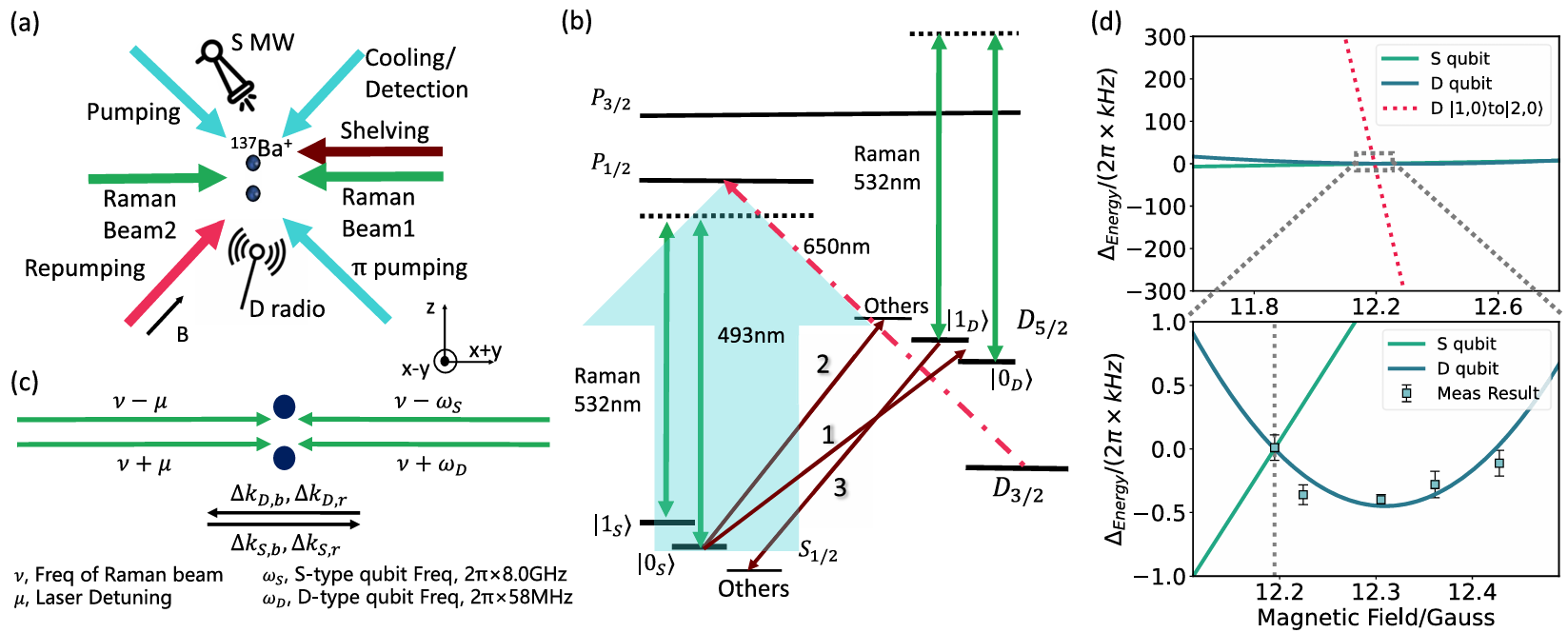 该工作完成了双重编码量子比特高保真度独立制备与探测,并演示了一种通用逻辑门方案,可以通过拉曼跃迁使用单个激光系统来实现复合编码量子比特之间的纠缠逻辑门。研究组使用137Ba+离子,在S1/2和D5/2超精细能级中编码了两种量子比特,并展示了在S-D离子对之间的纠缠逻辑门操作,实现了96.3(4)%的纠缠态保真度,与同类型的S-S或D-D门相当。该研究表明,使用双重编码量子比特间的纠缠逻辑门,将有利于降低量子线路深度。