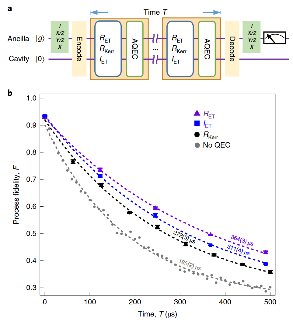 实验样品由一个超导量子比特、一个快速读取腔和一个高寿命存储腔构成,而逻辑比特是对存储腔中的光子态进行二项式编码构成。错误透明的门操作要求逻辑比特在编码空间和错误空间的演化完全一致。为此,研究组在实验中发展了一种新的量子比特驱动技术,称之为“PASS”(Photon-number-resolved AC-Stark Shift)。由于超导量子比特与存储腔有着极强的色散耦合,超导比特的本征频率会随着存储腔内的光子数的变化而变化。因此,在接近超导比特本征频率的频域范围内施加非共振驱动,就能诱导出存储腔内各个光子数态可控的频率偏移。通过设计这种频率偏移,逻辑比特在编码空间和错误空间可以进行完全相同的相位门演化,从而可以实现错误透明的相位门。实验显示,在发生错误的情况下,错误透明的相位门的表现确实比普通的相位门有显著的提升;而且在连续纠错的情况下,逻辑比特在错误透明的相位门操作下比普通相位门有更加优异的相干寿命,展示了该相位门的容错性。