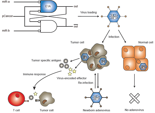 该研究构建了模块化的合成基因线路,在导入人体细胞后,感知整合细胞内的肝细胞癌特异启动子和microRNA信号,通过逻辑运算判断是否为肝癌细胞,调控溶瘤腺病毒在肿瘤细胞中选择性复制,从而特异性杀伤肿瘤细胞,提高了溶瘤病毒靶向肿瘤的安全性。此外,研究人员将不同免疫效应因子基因克隆到腺病毒载体中,在裂解肿瘤细胞的同时,表达释放免疫因子,提高杀伤性T细胞在肿瘤部位富集,增强抗肿瘤免疫反应。最后,研究人员通过仿真计算模型分析了影响溶瘤病毒与免疫效应因子联用治疗效果的关键因素,为提高溶瘤病毒联合治疗的有效性提供了思路和参考。