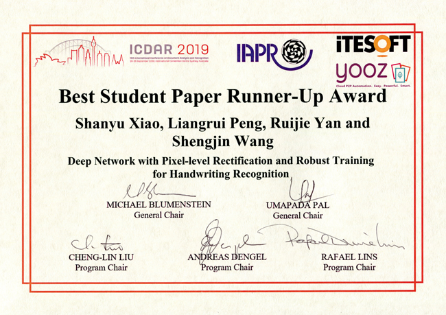 ICDAR 2019 “Best Student Paper Runner-Up Award”证书