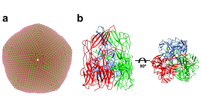 非洲猪瘟病毒结构:a. 依据非洲猪瘟病毒衣壳蛋白p72结构模拟病毒组装产生的非洲猪瘟病毒衣壳结构;b. 非洲猪瘟病毒衣壳蛋白p72三聚体冷冻电镜结构。