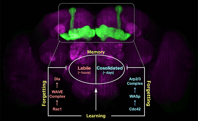 直到2010年,钟毅教授课题组首次发现了主动遗忘的生物机制,即学习过程本身会激活遗忘信号分子通路来主动地遗忘所形成的记忆。这种主动遗忘机制并不影响学习自身效果的好坏,而是特异影响已获得记忆遗忘速度的快慢。而且不同记忆组分会分别拥有专属的主动遗忘机制。如在果蝇嗅觉惩罚学习中,一次训练(5分钟)即可同时产生两种性质完全不同的记忆组分:不稳定的、维持几个小时的麻醉敏感记忆(ASM, anesthesia-sensitive memory)和较为稳定的、维持一天以上的抗麻醉记忆(ARM, anesthesia-resistant memory)。钟毅课题组先后发现一次学习会一方面激活小G蛋白家族中的Rac1分子来抹掉不稳定的、维持几个小时的麻醉敏感记忆,另一方面激活另一个小G蛋白家族成员Cdc42分子来遗忘较为稳定的、维持一天以上的抗麻醉记忆。然而Rac1与Cdc42分别介导的遗忘机制的具体下游分子通路还并不清楚。