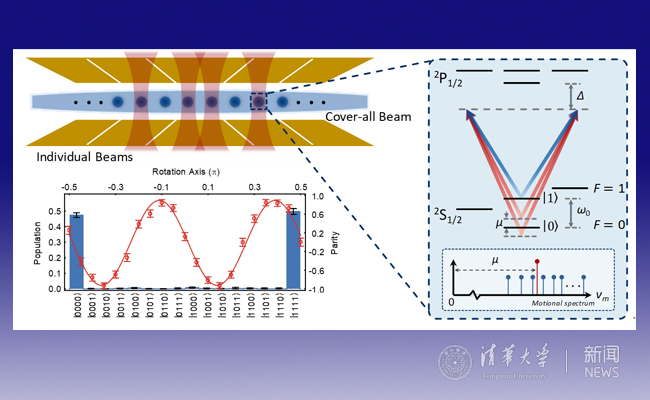 图 3 全局纠缠门的实验实现。左上图为基于离子阱的通用量子计算系统示意图。左下图为实验中制备的四量子比特最大纠缠态。
