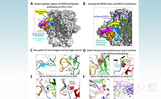 通过系统的序列比对、结构分析、定点突变等方法,课题组确定了这些突变主要集中在艾滋病病毒膜蛋白gp120与CD4受体结合区域,分布在inner domain(97位)、loop D(279、281、282位)和β23/loop V5 /β24(455、459、461、471位)等之上。这些突变影响广谱中和抗体对病毒膜蛋白结合能力,进而影响抗体对病毒的识别。广谱抗性艾滋病病毒的发现对基于广谱中和抗体的临床干预策略提出了严峻挑战,也为进一步优化和分选更强的广谱中和抗体提出了更高标准和要求。