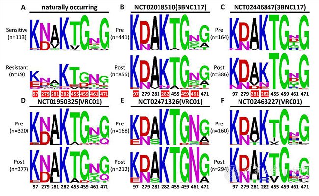 3BNC117和VRC01临床治疗前后对应位点氨基酸的变化