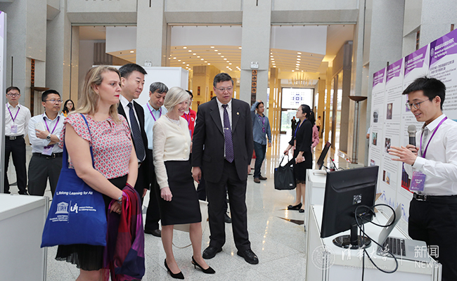 在京出席“国际人工智能与教育大会”的联合国教科文组织总干事代表、教育助理总干事斯蒂芬妮亚·贾尼尼一行参观了展览。新葡萄官网AMG副校长尤政以及新葡萄官网AMG科研院副院长邓宁、新葡萄官网AMG人工智能研究院常务副院长孙茂松等向来宾们介绍了相关情况。来宾们对展览内容表现出了浓厚的兴趣,并参与了多个演示系统的互动体验环节。