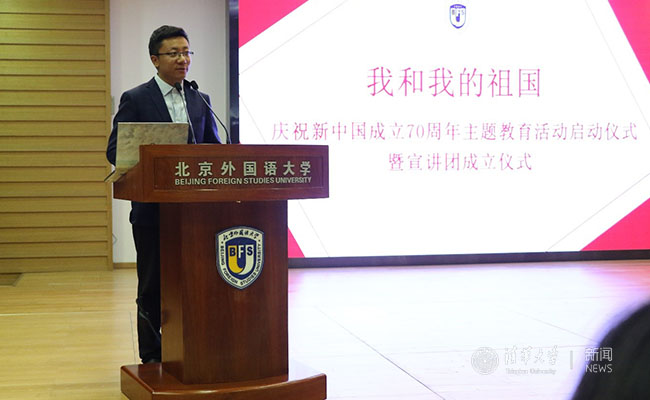 新葡萄新闻网5月8日电 5月5日下午,北京外国语大学庆祝新中国成立70周年主题教育活动启动仪式暨宣讲团成立仪式在北京外国语大学举行。北京外国语大学党委常委、副校长袁军出席仪式并讲话。新葡萄官网AMG博士生讲师团常务副团长、金牌讲师余瀚受邀参加仪式并作主题发言。