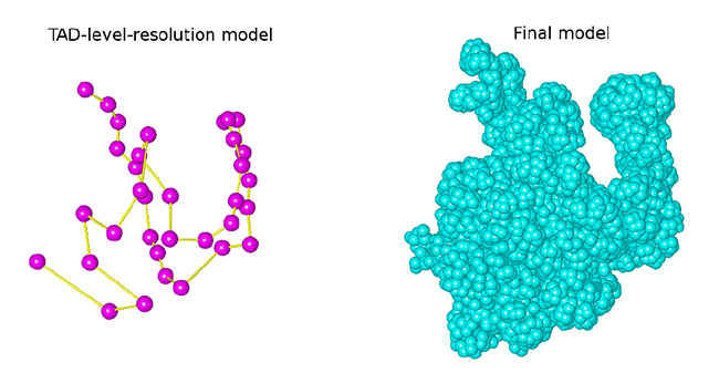 大量研究表明,染色体的空间结构与细胞内大多数的生物过程包括基因调控、DNA复制以及染色体异位等密切相关。因此,三维基因组结构解析对于细胞内生物过程的理解具有十分重要的意义。近年来,染色体构象捕获(3C)技术高速发展,通过与高通量测序技术相结合(Hi-C),可以直接获得全基因组范围内染色体相互作用图谱。基于染色体相互作用图谱,可以分析出染色体的层次结构并且重构出三维空间结构,从而为下游的分析和实验提供有价值的线索,并且为染色体折叠机制和功能的研究提供帮助。目前,由于Hi-C实验的限制,高分辨的三维基因组结构的重构难度较大。