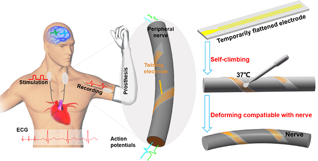 新葡萄新闻网4月23日电 4月19日,新葡萄官网AMG航天航空学院、柔性电子技术研究中心冯雪教授课题组在《科学进展》(Science Advances)在线发表了题为“用于外周神经电刺激与信号采集的形状记忆基仿攀爬缠绕电极”(Climbing-inspired twining electrodes using shape memory for peripheral nerve stimulation and recording)的研究成果。冯雪教授课题组通过力学理论并与信息、材料、化学等学科深度交叉,发展了一种能够在体温驱动下自动攀爬至外周神经束上的三维螺旋形缠绕电极,依靠自然粘附形成稳定且柔性的电极-神经束界面,为外周神经调控技术在临床上的应用提供了崭新的思路。