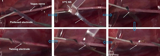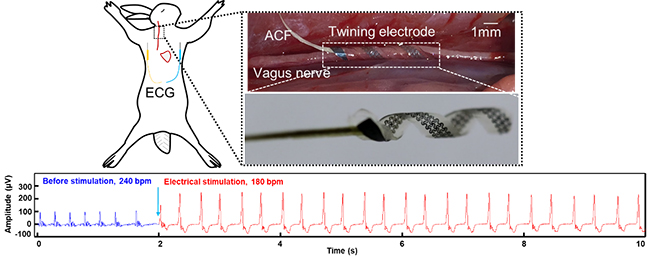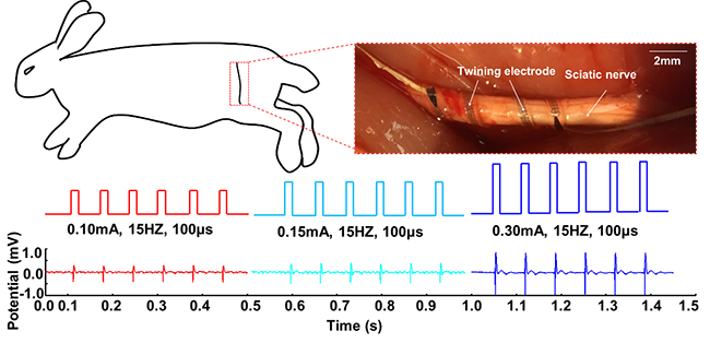 冯雪教授课题组还开展了两组在体动物实验,即迷走神经电刺激调控心率、坐骨神经电刺激与信号采集,分别验证了所发展的缠绕电极在外周神经电刺激与信号采集方面的应用潜力。