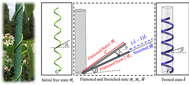 为指导仿攀爬缠绕电极的结构优化与设计,冯雪教授课题组还对自然界中的缠绕植的攀爬行为与粘附进行了系统的研究,用固体力学中有限变形理论揭示了植物攀爬的内在机理,给出了植物缠绕角的变化规律以及缠绕物与支撑物间的作用力。相关成果于2018年4月28日发表在固体力学顶级期刊《固体力学与物理学报》(Journal of the Mechanics and Physics of Solids),题为 “A finite deformation theory for the climbing habits and attachment of twining plants”(缠绕植物攀爬行为与粘附的有限变形理论)。