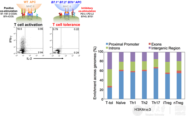 相对于活化T细胞识别杀伤入侵病原体,T细胞对自身抗原的耐受是防止自身免疫疾病的重要机制。在T细胞激活过程中,活化性共刺激分子(B7.1,B7.1,和B7h)以及抑制性共刺激分子(CTLA-4,PD-1,B7H3,B7S1等)的多寡决定了T细胞活化或者耐受的命运。当抑制性共刺激分子主导时,T细胞分化成耐受T细胞。研究者利用同时缺失主要共刺激分子B7.1, B7.2和B7h的抗原递呈细胞将CD4+ T细胞分化成耐受T细胞(图1) 。转录组联合表观组-组蛋白甲基化(H3K4me3和H3K27me3)分析发现,相对于效应性T细胞亚型(Th1,Th2,Th17),耐受T细胞展现独特的基因表达及表观修饰特征—效应基因表达大量下调,耐受及耗竭相关基因上调; 转录启动子区的H3K4me3修饰水平总体下降。