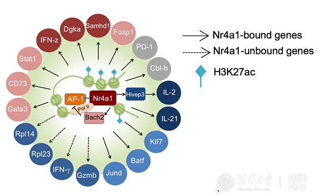 研究者进一步通过NR4A1 过表达的转录组学分析以及ChIP-seq 实验探究NR4A1调控T细胞功能失常的分子机制。他们发现,在耐受T细胞中,NR4A1的染色质结合位点与调控T细胞活化的关键转录因子AP-1的位点一致。进一步的实验证实,NR4A1能够竞争性结合AP-1在染色质的结合位点,从而阻抑AP-1-调控效应分子的表达。同时,NR4A1 结合位点与染色质超级增强子区域[Super enhancer]组蛋白乙酰化 (H3K27ac)水平正相关:过表达NR4A1增强该区域的H3K27ac水平,进而上调免疫耐受和耗竭相关基因的转录;而敲除NR4A1 下调这些位点的H3K27ac (图3)。上述研究鉴定了以NR4A1为核心的转录调控T细胞耐受及耗竭新机制。