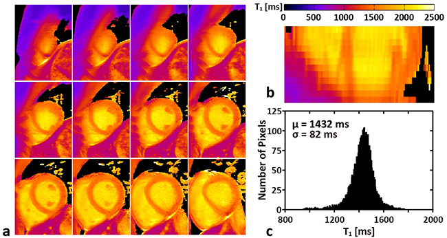 获奖论文提出了一种用于三维心肌纵向弛豫时间T1参数测量的新方法,可以在自由呼吸方式下只需三个采样点就可获得精准的心肌T1参数测量结果,并且原始加权图像内在配准,无需额外的运动校正等后处理。现有心肌T1参数成像多为屏气二维方法,论文工作将心肌T1参数成像拓展到三维,不仅要解决成像时间长、运动和呼吸伪影等心脏磁共振成像固有难题,还需要针对T1测量中稳态磁化向量的提取进行特殊设计,才能保证T1测量准确性和精确性。心肌T1参数测量可用于心肌组织定征,是目前心脏磁共振成像领域研究和临床应用研究热点。