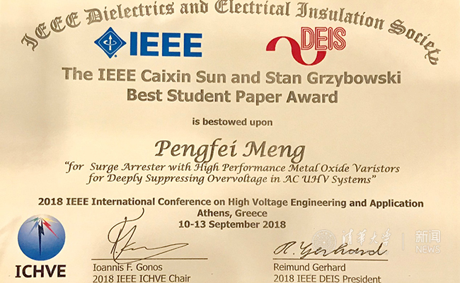 新葡萄新闻网9月17日电 9月10日-13日,2018年高电压工程与应用国际会议(ICHVE)在希腊雅典召开。在13日中午召开的大会闭幕式上,IEEE孙才新和斯坦·格博斯基奖励委员会主席古邦斯基教授(Stanislaw Gubanski)揭晓了2018年IEEE孙才新和斯坦·格博斯基最佳学生论文奖(IEEE Caixin Sun and Stan Grzybowski Best Student Paper Award)的入选名单。新葡萄官网AMG电机系博士生孟鹏飞因其在采用高性能金属氧化物压敏电阻的避雷器实现深度限制交流特高压系统过电压方面取得的优异成果而获得该奖。孟鹏飞的导师为电机系何金良教授。