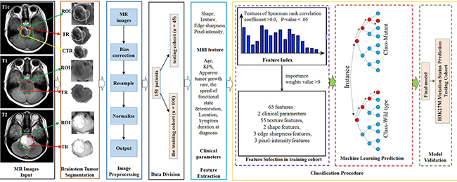 在此之前,H3 K27M基因仅能通过立体定向活检及肿瘤切除手术进行肿瘤样本提取,然后送到基因测序中心进行基因测序才能获得,过程成本高昂。而且这是一种有创检测方法,对患者身体造成损伤。另外,目前医生无法通过脑干肿瘤的磁共振影像进行预测H3 K27M基因突变的发生风险。研究团队利用机器学习、深度学习、影像组学等技术,深度挖掘脑干胶质瘤患者的磁共振影像学特征与特异性基因间的关联,取得了目前医疗手段难以获得的诊断效果。