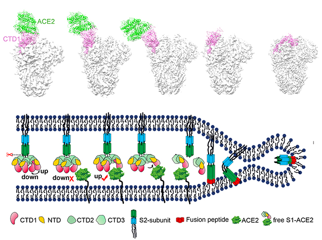 向烨研究组和王新泉研究组通过模拟SARS-CoV入侵宿主细胞的内环境,结合冷冻电镜单颗粒技术与生化手段,解析了蛋白酶切割后处于中性和酸性环境中的S蛋白的构象,以及蛋白酶切割后中性和酸性环中S蛋白与受体结合的多种不同构象,并捕捉到S蛋白结合受体后发生的构象变化以及融合后的构象,最高分辨率达3.6埃。通过对不同结构的分析与比较,研究者首先证实了前期提出的S蛋白受体结合所必需的构象状态,并且发现受体ACE2的结合使得S蛋白的C端结构域(CTD1,即受体结合结构域)继续向外偏转,诱导S1-ACE2脱落及S2亚基结构变化并暴露融合肽。该研究结果承接前面的研究进展,并填补了冠状病毒糖蛋白介导膜融合研究领域的空白。