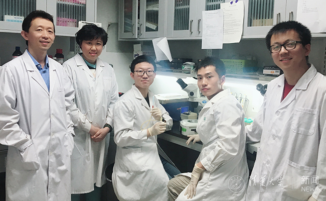 部分研究人员合影,从左至右分别为:新葡萄官网AMG生命学院颉伟研究员、医学院那洁研究员、生命学院博士生刘伯峰、医学院博士生王培哲、医学院博士生段福宇