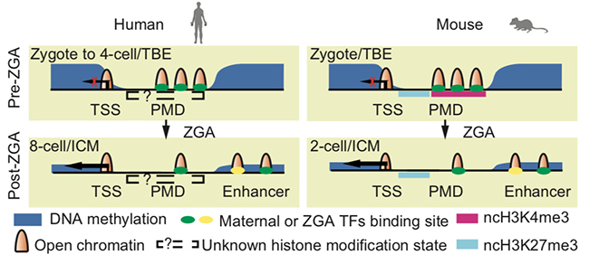 通过对人类胚胎发育中的开放染色质区域的研究,研究人员首先鉴定出了人体早期胚胎发育过中可能的重要转录因子,通过和小鼠早期胚胎发育调控的对比分析找到了物种保守和特异的转录因子。有趣的是,人体基因普遍是在受精后发育至8细胞时期才激活,而研究人员发现在基因组激活前的1到4细胞时期染色体上就存在大量的开放区域。这些开放区域很多集中在CpG(胞嘧啶(C)—磷酸(p)—鸟嘌呤(G))含量较高的启动子区。研究结果显示这种启动子区的提前开放与未来的基因激活相关。然而令研究人员惊讶的是,很多远端非启动子区也有很强的开放性,并且这些区域富集转录因子的结合位点。然而这些开放染色质区域随着全基因组转录的激活反而大量消失。随后细胞在很多新的调控元件位置建立起开放染色质区域。进一步研究发现,在1到4细胞时期远端开放染色质区域倾向于出现在母本染色体特异的DNA低甲基化区域。在小鼠胚胎中,这些DNA低甲基化区域也通常出现开放染色质,并且拥有一种参与转录沉默的特殊非经典组蛋白修饰H3K4me3。在小鼠基因组激活后,这种非经典修饰H3K4me3被擦除,同时伴随着这些区域染色质的关闭。