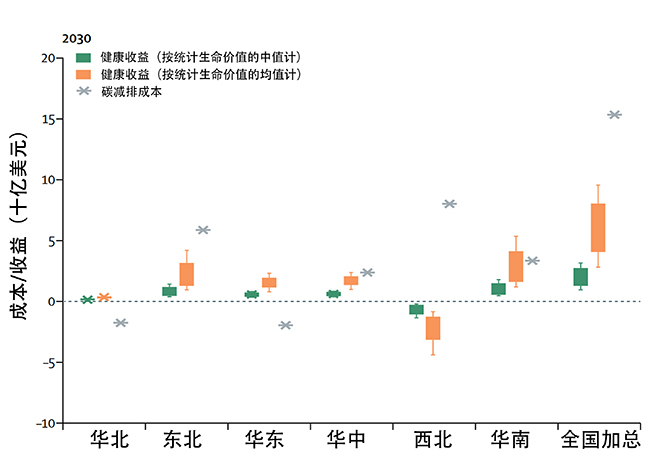 然而,目标对于不同区域的人群健康影响存在显著差别。中国电力行业实现自主减排贡献目标将显著改善华北、华中、华东、东北以及南方地区的能源结构,同时也带来空气质量的改善以及显著的健康协同效应。但是,作为能源资源中心,西北地区承担了电力输出的责任——为其他地区生产低成本的煤电,若其煤电技术没有匹配足够的大气污染物控制技术,将导致该地区空气质量恶化并遭受健康损失。