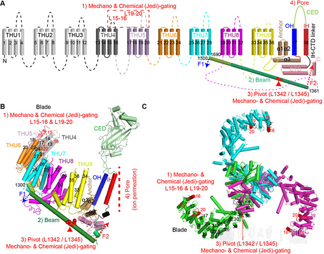 Piezo1通道利用杠杆原理进行化合物(Jedi)或机械门控的作用机制示意图。(A,B)由9个重复性的、以4次跨膜区为基础的跨膜螺旋单元(THU)所组成的38次跨膜区的拓扑结构示意图(A)及结构组成展示图(B)。(C)Piezo1通道的三聚体三叶螺旋桨状结构。参与机械力及Piezo1激动剂(Jedi)感受与传递的关键功能位点1-3组成分子内杠杆传递装置,从而将外周THU所感知的细微机械力或小分子化合物Jedi结合(F1,蓝色虚线箭头)有效传递并放大到用于控制中心孔道区开放的作用力(F2,红色虚线箭头),从而有效控制其通道的开放和选择性阳离子通透(图B,C)。