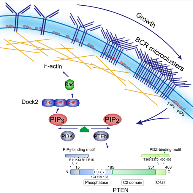 该论文发现磷脂酰肌醇-3-羟基酶(PI3K)调控的磷脂酰肌醇3,4,5-三磷酸(PIP3)的产生调控B细胞受体微簇体的生长,同时同源性磷酸酶张力蛋白(PTEN)的精准膜定位及其脂质磷酸酶活性介导其对这一过程进行负向调节。更进一步的机制研究表明,依赖于磷脂酰肌醇3,4,5-三磷酸的招募作用而聚集并且活化的鸟苷酸交换因子码头蛋白2能够通过调控纤维肌动蛋白(F-actin)细胞骨架的排布影响B细胞受体微簇体的生长,进而影响B细胞活化。缺失码头蛋白2的B细胞免疫突触形成严重受损,进一步揭示了码头蛋白2通过调控B细胞骨架来调控B细胞免疫突触形成。同时该研究发现B细胞特异性缺失同源性磷酸酶张力蛋白(PTEN)的小鼠接受抗原免疫后抗体应答水平显著增强。